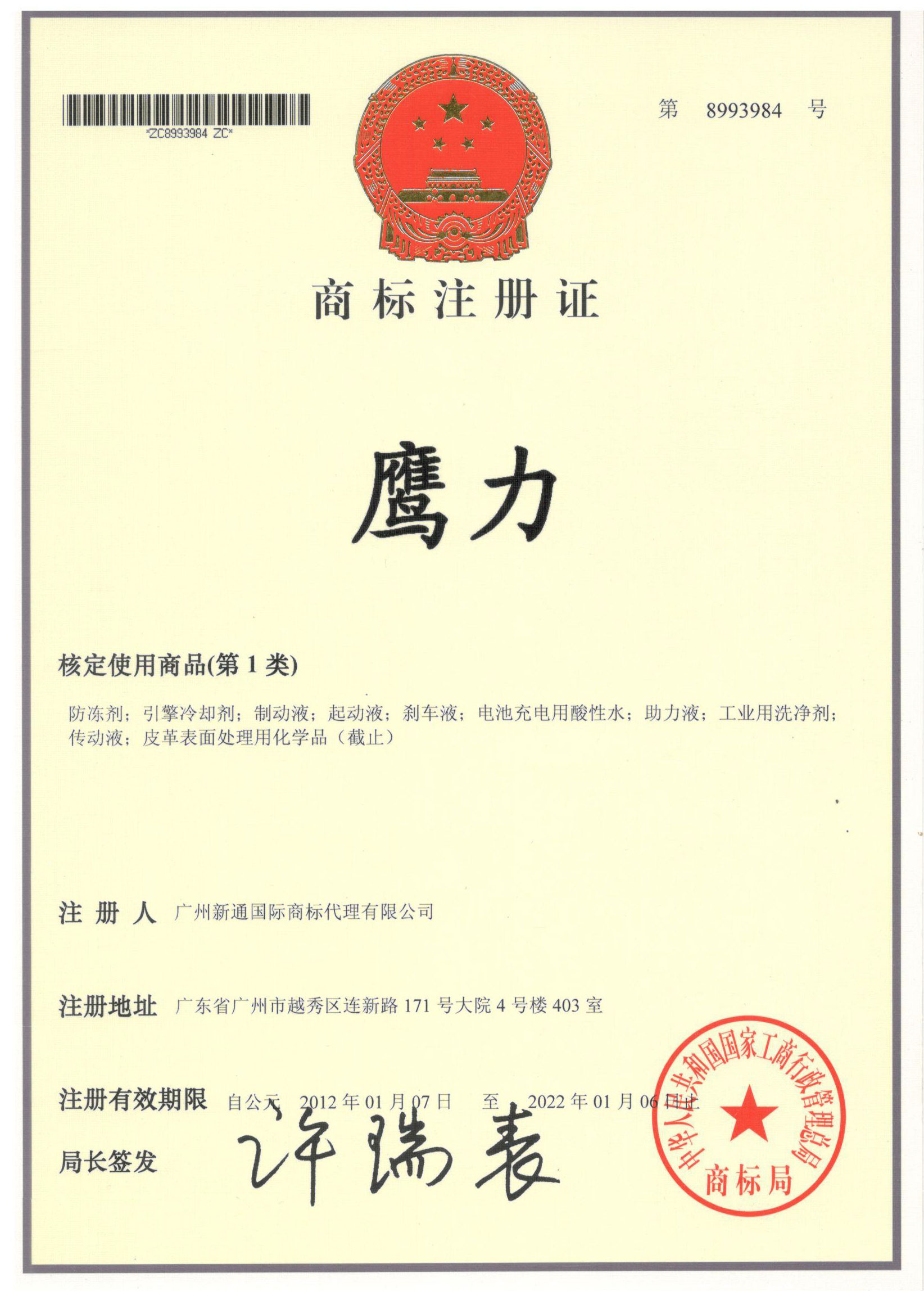 鹰力商标注册证2